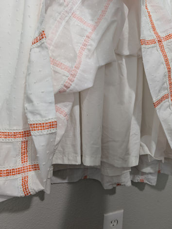 Self patterned dress and apron set. Dress is 100% linen, with a cotton lining, hand sewn button holes and trimmings. The apron uses a velcro closure, with a set of metal snaps to attach the large bow.