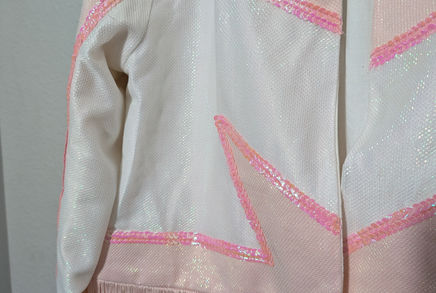 Performance jacket. Made from altered commercial pattern, using sequined fabric and satin, with iron-on vinyl detailing. Front closure consists of a series of metal snaps, easing the removal of jacket during performance. Additional tulle was sewn underneath arms of jacket to prevent the pilling of the satin.